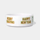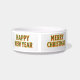 Tigela de Natal para cães com Feliz Natal e Ano Novo em letras vermelhas e verdes contornadas em amarelo e personalizável com o nome do animal de estimação. Ótima ideia de presente para amigos ou familiares com animais de estimação durante as festas.
