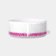 Tiras brilhantes impressas cor-de-rosa claro com aspersão de poeira de confetti e nome de gato ou cão personalizado numa comida de cão ou de gato cerâmico branco e numa tigela de água. Insira qualquer texto personalizado que você quiser para uma comida de animais de estimação feminina e cintilante ou uma tigela de água. Vejam a nossa coleção de tigelas de coordenação e arranjem um conjunto!