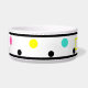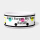 Personalize o nome do animal de estimação em texto preto dentro de uma área retangular amarela. A citação humorística Não esqueça de reabastecer minha água está escrita no lado oposto do nome. Pontos coloridos geométricos com acabamento de borda preta e pontos rosa, amarelo, turquesa e preto contra fundo branco. Obra de arte original e design de citação TamiraZDesigns.