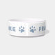 Este único cão de estimação ou tigela de gato personalizado apresenta seu nome no estilo moderno de todos os bonés com sotaques de impressão de pata giros ao redor da tigela. Um design simples e limpo para o seu membro peludo da família. Nota, o texto azul da cinza de ardósia e a cor da impressão da pata podem ser modificados.