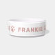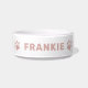 Este único cão de estimação ou tigela de gato personalizado apresenta seu nome no estilo moderno de todos os bonés com sotaques de impressão de pata giros ao redor da tigela. Um design simples e limpo para o seu membro peludo da família. Nota, o texto cor-de-rosa-rosa e a cor da pata podem ser modificados.