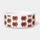 Uma tigela de estimação personalizada com um arco festivo de Natal em vermelho e ouro. Cercados por flores de poinsettia, pinheiro e decorações de Natal.