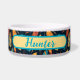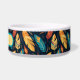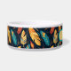 Tigela de pet no estilo sudoeste americano nativo, brilhante e colorida, apresenta penas turquesa, laranja, amarelo e ferrugem contra um fundo preto. No centro, há uma faixa cor de pêssego onde você personaliza com o nome do seu cão.