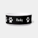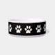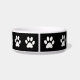 Tigela para cachorro pequeno com pegadas brancas e fundo preto e um local onde você pode adicionar o nome do seu cão, tornando este um design de tigela de pet sofisticado. Use a sua para uma tigela de água, tigela de comida ou recipiente para todos os petiscos do seu cãozinho.
