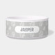 Tigela para cão ou gato com estampa de patas e coração em tons cinza com etiqueta de nome, para o companheiro mais fofo. Selecione o tamanho e personalize facilmente o texto. - Kate Eden Art