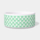Esta tigela de pet apresenta um padrão de pegadas de cachorro brancas em um fundo verde menta. Há também uma faixa marrom com uma área de texto personalizável para o nome do seu pet. A cor bege pode ser alterada para qualquer outra cor sob personalização.