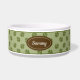 Fundo de padrão de impressão de pata de cachorro verde com um crachá marrom que tem uma área de texto personalizável ideal para o nome do animal de estimação. A fonte é uma linda fonte de caligrafia em cor branca para combinar com o material branco da tigela. Este design é ideal para um espaço decorado em estilo rústico ou para quem gosta da combinação de cores marrom e verde que vemos na natureza.