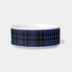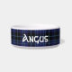 A xadrez tradicional azul e preta do Clark clan tartan ao redor desta tigela branca de cão cerâmico. O texto branco personalizado está pronto para personalizar com o nome do seu animal de estimação. Faz uma ideia de presente de excelente para um novo dono de cachorro.