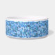 Uma tigela azul clara com um padrão bonito vem em dois tamanhos para gatos e cães.