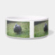 Esta tigela de estimação incrível mostra uma fotografia de um pombo selvagem tirada no meu quintal. O pássaro estava bicando na grama à procura de sementes que tinham sido derrubadas de um alimentador de pássaros. A iridescência das penas é claramente visível na foto.