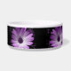 Esta incrível tigela de estimação apresenta uma fotografia lindamente detalhada de uma flor margarida africana. A foto foi alterada digitalmente, resultando em uma bonito flor púrpura com diferentes tons de púrpura nas pétalas e um centro roxo escuro.