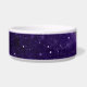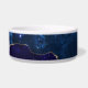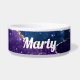 comida de animais de estimação/placa de água feita em cerâmica branca, com banda, ao redor da tigela, com gráficos de aspecto roxo, azul e dourado agitado. O texto branco personalizado está pronto para personalizar para o seu bebê de pele.