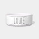 Uma tigela de animais de estimação do estilo moderno da fazenda para cães ou gatos apresenta o nome do seu animal de estimação em cinza de carvão com letras escritas à mão com sotaques riscados.