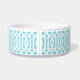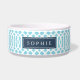 Uma tigela de comida de cão ou gato, com um padrão de pisca azul-céu e um marcador de espaço retangular para o seu querido nome de animal.