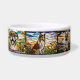 A dog bowl featuring stained glass depictions of seven dog breeds. Clockwise they are Golden Retriever, Rottweiler, Malamute, Black Lab, Boxer, Collie, and German Shepherd.