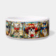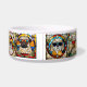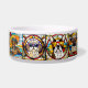 A dog bowl featuring ten stained glass depictions of small dogs. From left to right, they are Shih Tzu, Yorkie, Chihuahua, Welsh Corgi, Pomeranian, toy poodle, Dachshund, Lhasa Arso, Boston Terrier, and a pug.