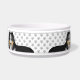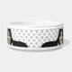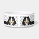 A ilustração original do desenho animado de Destei de um bonito tricolor Shetland Sheepdog / cão da raça Sheltie. O desenho do cão é colocado quatro vezes nesta tigela e de forma a que o corpo superior e a cabeça sejam visíveis criando um close-up da ilustração do cão. Há também um retângulo preto que tem uma área de texto personalizável para um nome. O fundo tem um padrão de pegadas de cinza. O topo e o fundo têm bordas de cor de cinza.