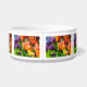 Violeta colorida, tulipas roxas, cor-de-rosa num leito de flores. Praticamente todas as cores do arco-íris estão presentes. Bela e positiva cena floral. Tigela para animais de estimação.