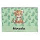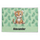 Um bonitinho filhote de tigre de desenho animado se senta sobre um fundo verde de folhas tropicais.