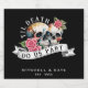 Legal até a morte, fazemos parte das etiquetas das garrafas de vinho recepção de casamento com crânios e rosas de aquarelas. Fundo preto. Personalize-o com os detalhes do evento.