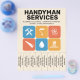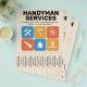 A professional handyman services flyer with tear-off tabs and colorful tiles layout featuring bold blue and orange color scheme. The center showcases a collection of icons including a wrench, hammer, paint brush, handsaw, water drop and a house. Fully customizable, it can be suitable for all kinds of repair activities such as handyman, home repair services, renovation, plumbing, drywall, painting, carpentry, etc.