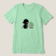 Ninja adorável vestida de preto está sentada de pernas cruzadas perto de uma plantação e regando uma pequena árvore bonsai. A espada japonesa de katana está amarrada nas costas.