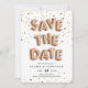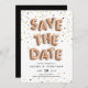 Casamento único salvando os cartões de data com "SALVAR A DATA" soletrado em balões de ouro rosa, em um fundo de ouro rosa, ouro e confete preto. Personalize com seus detalhes de casamento abaixo, incluindo data, local e seu site de casamento, ou uma indicação de que será seguido um convite formal. Cartões em preto sólido.