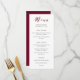 Este maravilhoso menu de casamento apresenta uma caligrafia colorida marsala/burgundy junto com texto preto moderno, num fundo branco elegante. Perfeito para um casamento formal e tradicional com um giro moderno!