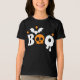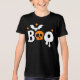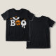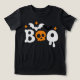 Halloween Boo Skull Bats Modern Typografia Tri-Blend Shirt apresenta o texto "Boo" na tipografia moderna laranja e branca, acentuada com morcegos, estrelas e crânio. Perfeito para festas de Halloween e comemorações. Criado pelo Evco Studio www.zazzle.com/store/evcostudio