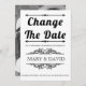 Vintage elementos e casamento de tipografia em preto e branco Mude o anúncio de adiamento de data. Este elegante design de casamento exibe o texto "Alterar a Data" em negrito tipografia negra e elementos de vintagem que formam quadros para o texto. A parte de trás apresenta uma foto do casal.