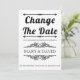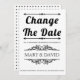 Vintage elementos e casamento de tipografia em preto e branco Mude o anúncio de adiamento de data. Este elegante design de casamento exibe o texto "Alterar a Data" em negrito tipografia negra e elementos de vintagem que formam quadros para o texto. O dorso apresenta um padrão geométrico.