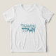 A design de camiseta é para uma sobremesa chamada Tiramisu Titan. O texto é escrito em uma fonte de estilo gotejando, grafite com cada letra em um tom diferente de azul. A design tem um fundo escuro.