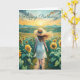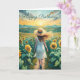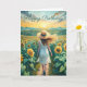 Uma mulher caminhando por um campo de girassóis. Adequado para um aniversário para qualquer um. Você pode alterar o texto