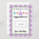 Este cartão de Dia das Bruxas do professor apresenta um fundo de xadrez roxo e branco com sotaques verdes e diz: "Sem truques é só um presente. Feliz Dia das Bruxas!" e um belo trio de fantasias. Há também espaço para deixar um cartão-presente. Personalize com o nome do seu filho.
