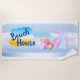 Toalha personalizada no design da Casa Azul de Praia com balde de areia e bola de praia. O design tem dois temas: padrão azul e padrão rosa e azul.