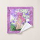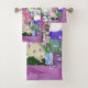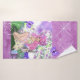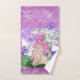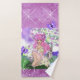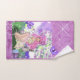 Menina com flores e borboletas no conjunto de toalhas. Roxa