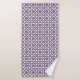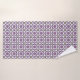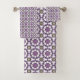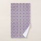 Conjunto de toalhas com um padrão floral geométrico roxo e branco pendurado em uma haste. Abaixo, um pano de rosto mostra o mesmo desenho com uma quina dobrada.