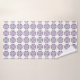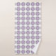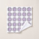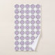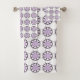 "Toalhas estampadas exibidas, apresentando um design repetitivo de formas florais roxas com contornos pretos em um fundo branco. A imagem superior mostra a toalha pendurada em uma haste, enquanto a imagem inferior exibe uma toalha de rosto dobrada. O design transmite uma estética limpa e decorativa."