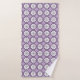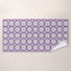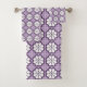 Um conjunto de toalha e toalhinha com um padrão geométrico é exibido. O design apresenta motivos florais brancos em um fundo roxo, criando uma aparência moderna e elegante.