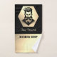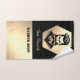 Esta toalha de barbeiro profissional oferece uma apresentação profissional, elegante e moderna da sua empresa com este logotipo preto e dourado com um homem barbudo com cabelo ondulado, seguido pelo nome pessoal/da sua empresa.