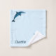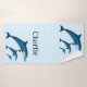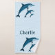 Um conjunto de toalhas azuis com golfinhos fofos. Em cada toalha, você pode personalizar adicionando seu nome.