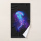Água-viva grande, azul, desenhada artisticamente, brilhante, brilhante, com longos tentáculos sobre fundo preto com bioluminescência roxa. Água-viva luminosa.