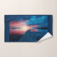Toalha de mão com uma bela fotografia. Um lugar cênico. Um lago tranquilo com uma doca de madeira que se estende para fora. Definir o sol fornece lindas cores no céu, vermelho e azul vibrantes.