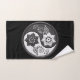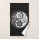 A yin yang symbol features intricate floral patterns on each side, one half in silver and the other in black. Delicate leaves and swirls add to the symmetrical elegance.