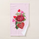 Acentue a decoração do banheiro com uma toalha de mão de Dia dos Namorados. Esta toalha apresenta corações vermelhos e rosados e uma rosa vermelha linda. Personalize o texto no coração vermelho grande com suas palavras ou compre como mostrado com "Feliz Dia dos Namorados".