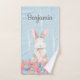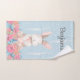 Esta adorável toalha de mão coelho é perfeita para um banho de creche de bebês ou um banheiro infantil. Esta toalha de mão de um animal de floresta apresenta um fundo de floresta azul macio com um coelho sentado numa cama de flores bonito, rosa e azuis. Personalize com o nome de sua escolha e é perfeito para um garoto ou uma garota.
