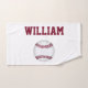 Toalha de mão de suor com tema desportivo feita em branco com gráficos de basebol vermelhos e brancos. O texto vermelho grande e negrito está pronto para personalizar para ler o que você quer.