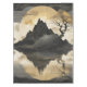 Esta pintura retrata uma floresta lua, com uma árvore solitária em pé. A lua e a montanha refletem-se na água abaixo, criando uma bela e serena cena. A pintura é um lembrete da beleza e mistério da natureza.