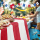 Americana red and white wide striped celebratory patriotic 4th of July tablecloth.