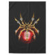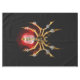 Aranha mecânica, com pá-pá de ouro, engrenagens de latão e uma lâmpada de vidro vermelha sobre fundo preto. Estilo Steampunk.
